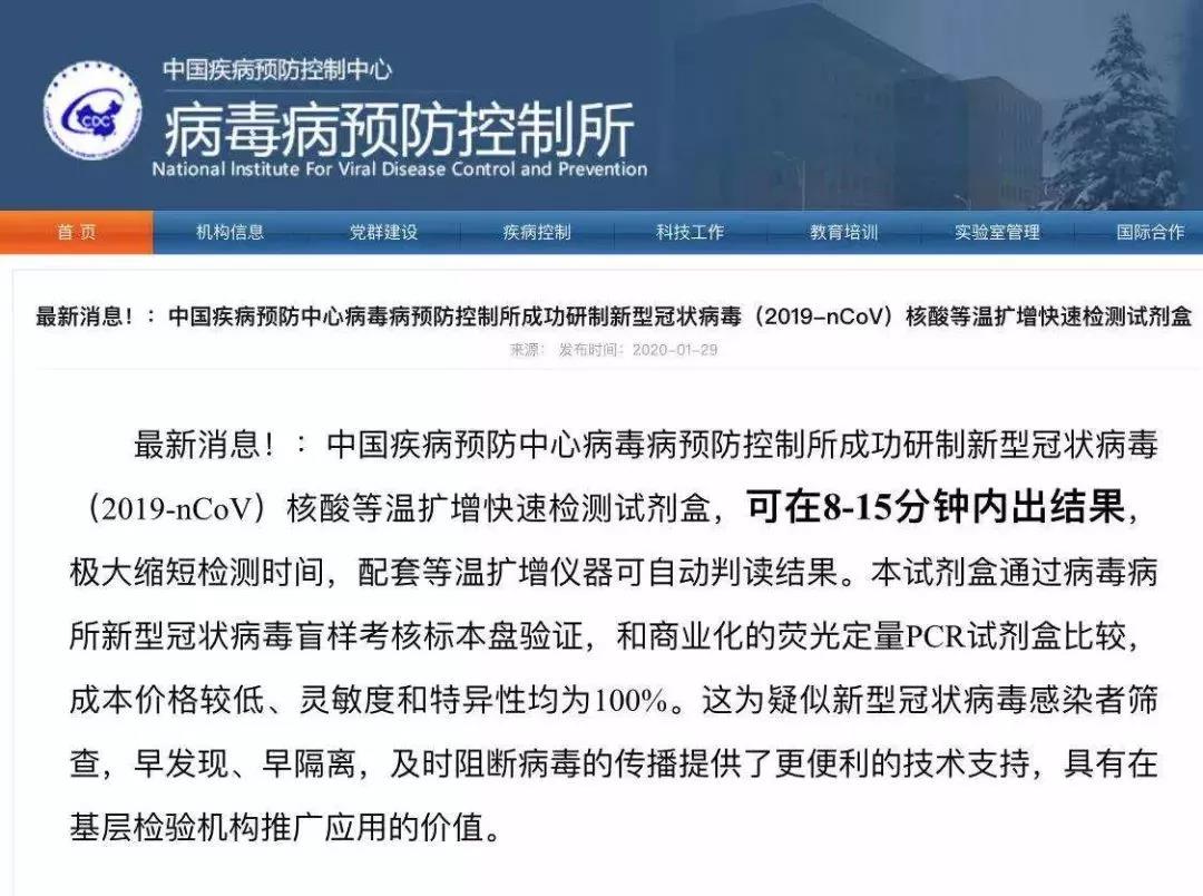然而據《健康時報》報道,中國疾病預防中心病毒病預防控制所官網1月29日發布最新信息顯示,其研制新型冠狀病毒(2019-nCoV)核酸等溫擴增快速檢測試劑盒,可在8-15分鐘內出結果,極大縮短檢測時間,配套等溫擴增儀器可自動判讀結果。并稱其試劑盒通過病毒病所新型冠狀病毒盲樣考核標本盤驗證,和商業化的熒光定量PCR試劑盒比較,成本價格較低、靈敏度和特異性均為100%。