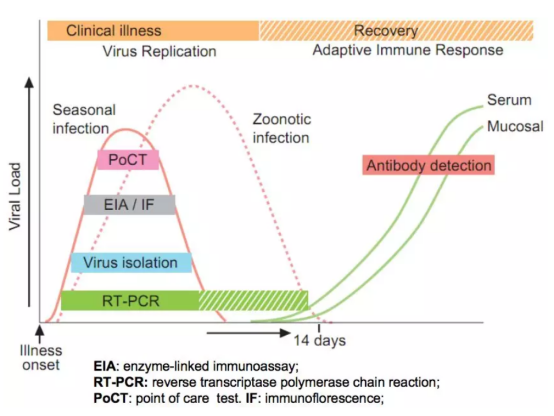 由于新型冠狀病毒2019-nCoV的臨床研究有限,因此我們參考流感檢測時間窗口明確當前新冠病毒2019-nCoV的實驗室檢測方法的選擇。根據流感檢測的時間窗口我們可以看到比如POCT、熒光檢測技術、病毒分離培養法、RT-PCR、抗體檢測等方法,它們檢測的時間和時間段有所不同,病毒抗原檢測(以POCT或熒光檢測技術開展),病毒分離培養法和核酸檢測(以RT-PCR技術開展)的檢測窗口靠前,抗體檢測滯后。呼吸道病毒診斷做抗體檢測或者培養在臨床診斷中價值不高,前者影響因素太多(如產生抗體的時間窗較長,受人體自身免疫狀況影響較大),后者很難滿足即時檢測的需求。因此在各項指南和共識中指出目前臨床上針對流感病毒的病原學檢測集中于抗原檢測和核酸檢測兩項,而針對新型冠狀病毒2019-nCoV的病原學檢測僅限于核酸檢測。