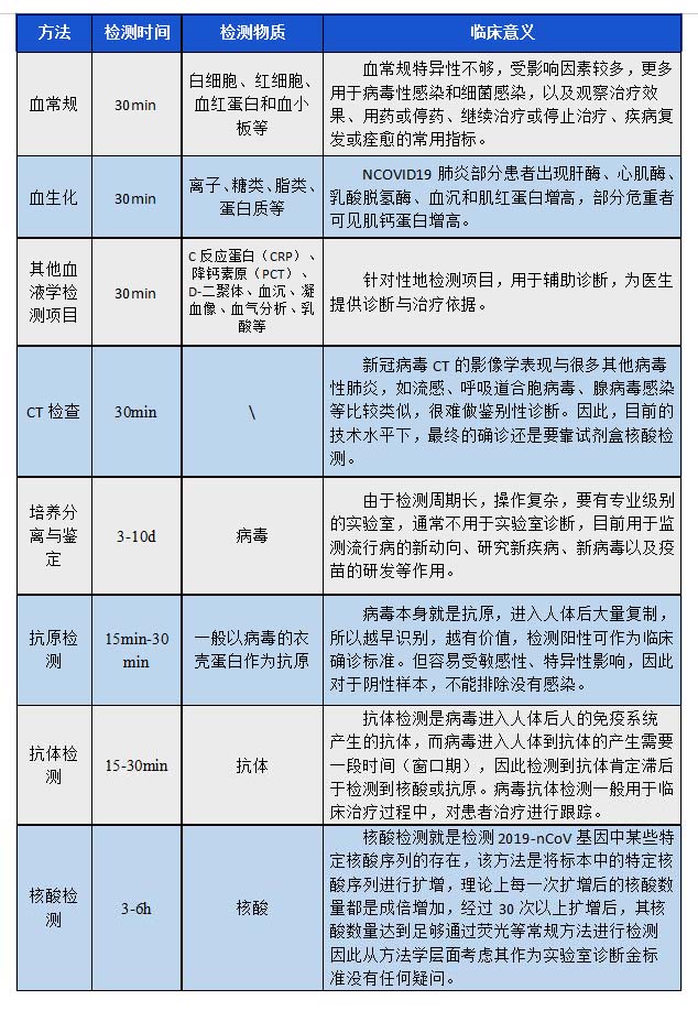 說明:主要以國家衛健委出臺的方案為準,武漢和北京醫院的方案與國家衛健委方案不沖突,作為輔助參考,鑒于新型冠狀病毒2019-nCoV屬于新型病毒,其相關的各項研究均屬于早期階段,缺少大量臨床數據支撐,故部分檢測方案數據參考國家衛健委發布的SARS肺炎診斷標準和流感診斷方案。