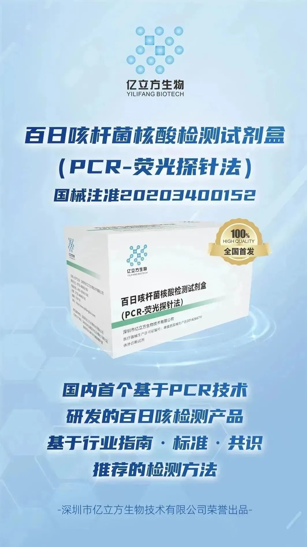 ? ? ??該產(chǎn)品適用于檢測人口咽拭子或鼻咽拭子樣本中的百日咳桿菌DNA,是全國首個(gè)獲批第三類醫(yī)療器械注冊(cè)證的產(chǎn)品,目前已廣泛應(yīng)用于全國各大醫(yī)院。