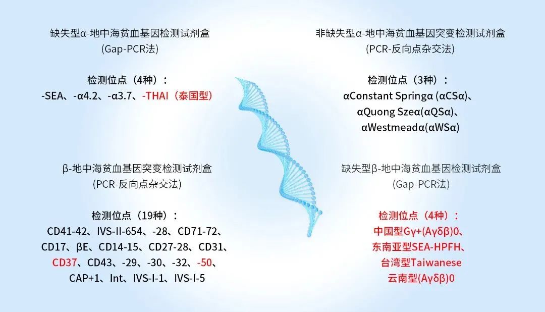 《國械注準20173403268》、《國械注準20193400137》、《國械注準20193400139》獨家可覆蓋26種基因變異型,增加缺失型α-地貧泰國型、β-地貧CD37型和-50型,是目前市場上檢測型別較為全面的產品,很大程度上降低了漏檢的風險。