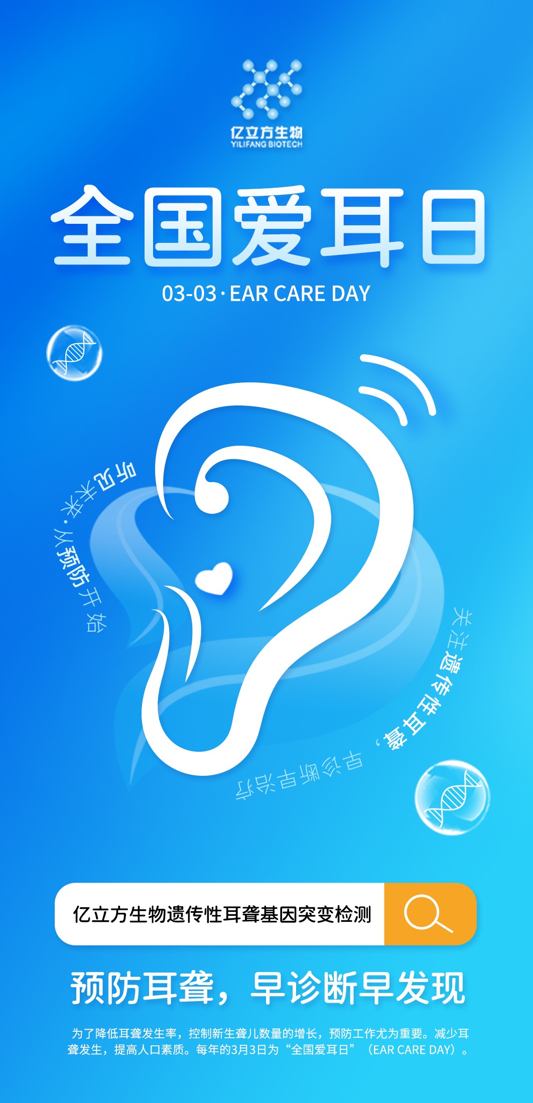 在第25個全國“愛耳日”到來之際,強調了耳聾基因檢測在提升聽力健康和生活質量方面的重要性。我們要更科學地認識耳聾,主動利用科學手段對新生兒聽力障礙做到早診斷、早發現、早干預、早治療,這是降低出生缺陷率、促進生育健康的關鍵步驟。