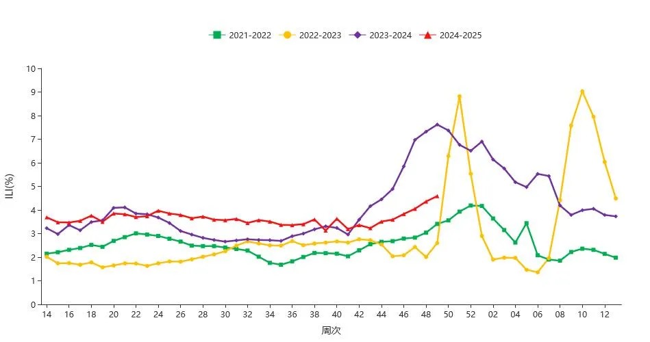 2024年第49周,北方省份哨點(diǎn)醫(yī)院報(bào)告的ILI%為 4.6%,高于前一周水平(4.4%),高于2021~2022年同期水平(3.4%和 2.6%),低于2023年同期水平(7.6%)。