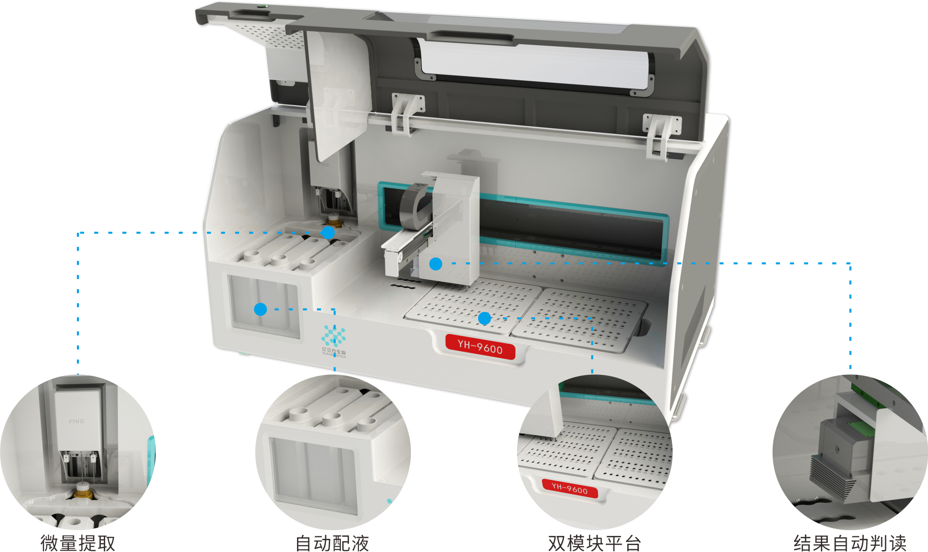 全自動核酸分子雜交儀YH-9600,是集雜交、洗膜、POD孵育、洗脫、顯色全流程一體機。雙模塊,可同時做地貧、耳聾,G6PD、HPV等項目。高效運行,全國獨家技術,中間無需人工干預,最大可實驗 96人份,每個平臺分別可完成48人份量。