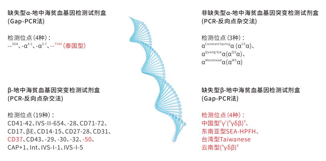 獨家可覆蓋26種基因變異型,包含4種α缺失(包含泰國型)、3種α突變及19種β突變(包含CD37、-50型),是目前市場上檢測型別較為全面的產品,在很大程度上降低了漏檢的風險。