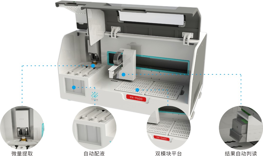 高通量、自動化、雙模塊、開放平臺、數據智能化平臺:YH9600全自動核酸雜交儀可實現自動配液、雜交、洗膜、POD孵育、洗脫、顯色、判讀、數據自動上傳Lis系統,全流程一體機,中間無需人工干預。